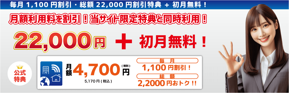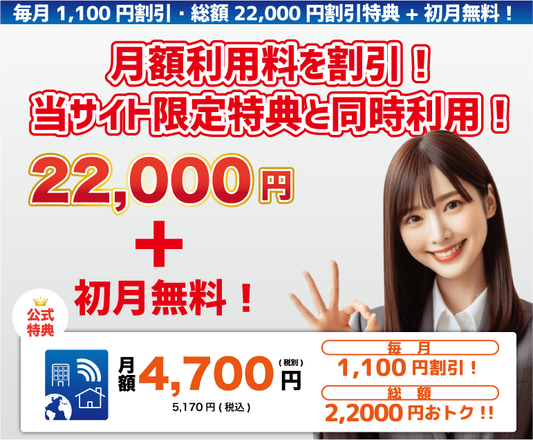 毎月1,100円割引・総額22,000円割引特典 + 初月無料!について詳細はコチラ