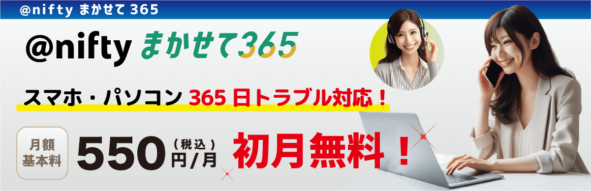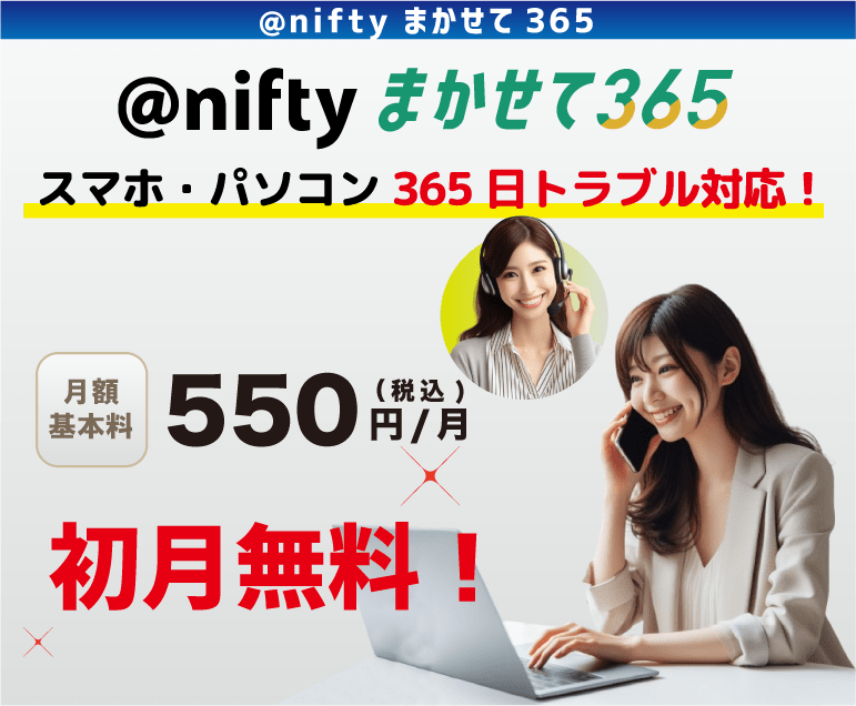 相談窓口:365日 9:00~21:00 パソコン・スマートフォンやインターネットのトラブルが発生しましたら、通話料無料の@niftyまかせて365専用窓口までお電話ください。 オペレーターがお客様の相談内容をもとに最適なサポートのご提案をいたします。 窓口は年中無休9:00~21:00まで対応しています。 |