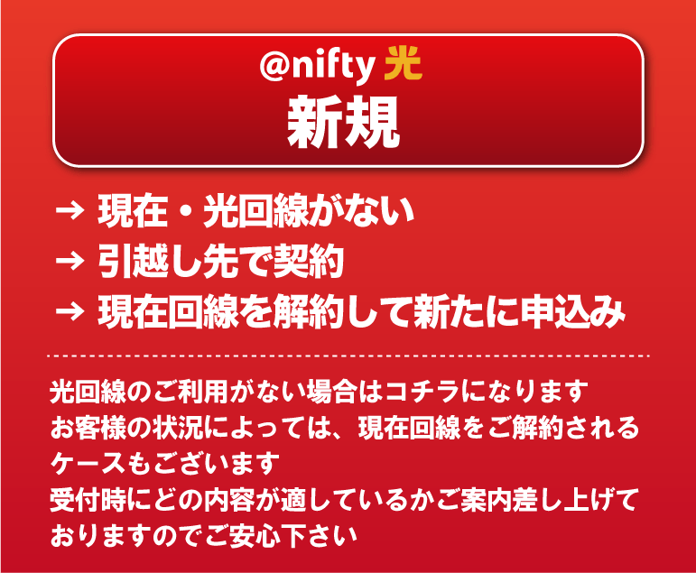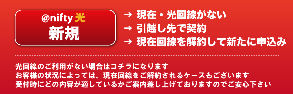 「現在光回線がない」、「引っ越し先でご利用」などがコチラになりますその他光回線からの乗り換え(auひかり・NURO光・J:COM・eo光・コミュファ光など)の場合も新規となります
