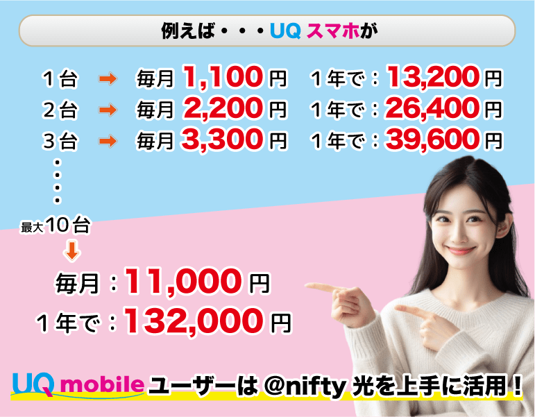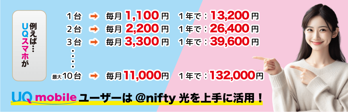 @nifty光をご利用のお客様は、UQモバイル携帯電話の料金が最大1100円割引になります※1※2。(毎月・永年)一緒にお住まいの家族10人までが対象となりますので、人数が多い程おトクにご利用出来ます
